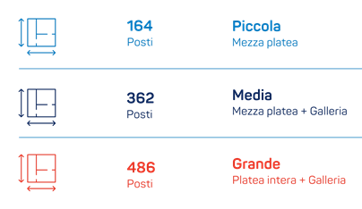 È strutturata su due livelli, con una platea frontale e una galleria rialzata, e può essere configurata in tre modalità in base alla capienza richiesta: piccola (164 posti, mezza platea), media (362 posti, mezza platea e galleria) o grande (fino a 486 posti, platea intera e galleria).
